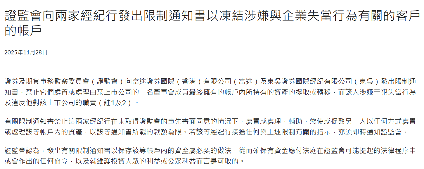 11月28日,香港证监会向富途证券国际(香港)有限公司(富途)及东吴证券国际经纪有限公司(东吴)发出限制通知书,禁止它们处置或处理由某上市公司的一名董事会成员最终拥有的帐户内所持有的资产的提取或转移,而该人涉嫌干犯失当行为及违反他对该上市公司的职责。有关限制通知书禁止这两家经纪行在未取得证监会的事先书面同意的情况下,处置或处理、辅助、怂使或促致另一人以任何方式处置或处理该等帐户内的资产,以该等通知书所载的款额为限。若该等经纪行接获任何与上述限制有关的指示,亦须即时通知证监会。