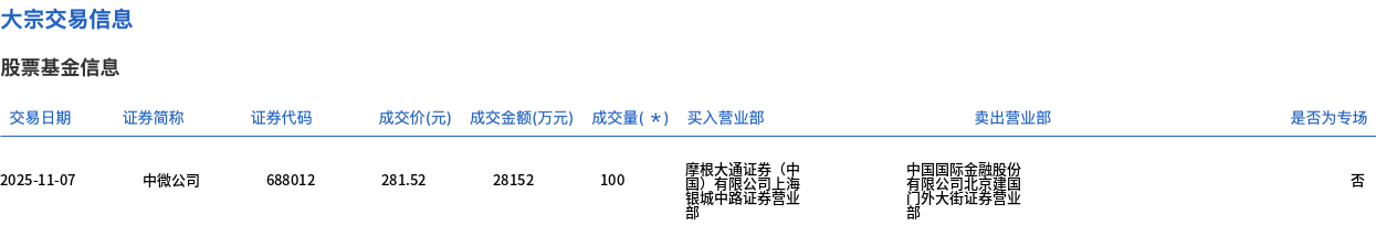 11月7日,中微公司大宗交易成交100万股,成交额2.82亿元,占当日总成交额的5.63%,成交价281.52元,较市场收盘价309.14元折价8.93%。